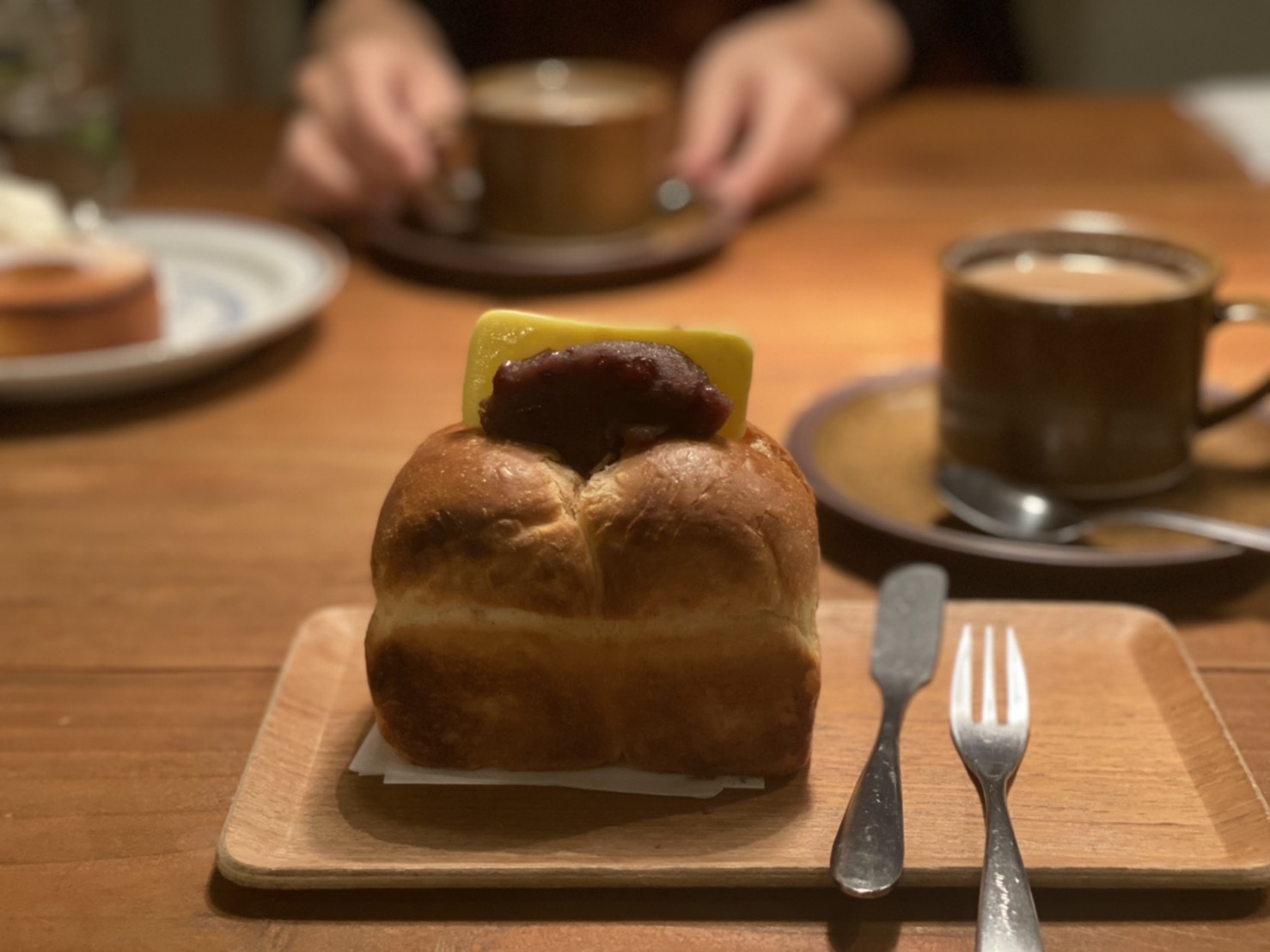 「 真ん中をナイフで切ると食べやすいです 」とオーナーさんがおっしゃって下さったので実践したら、ふわふわのパン生地の断面から溶けたバターとあんがトロ~リと垂れてて、もう優勝。