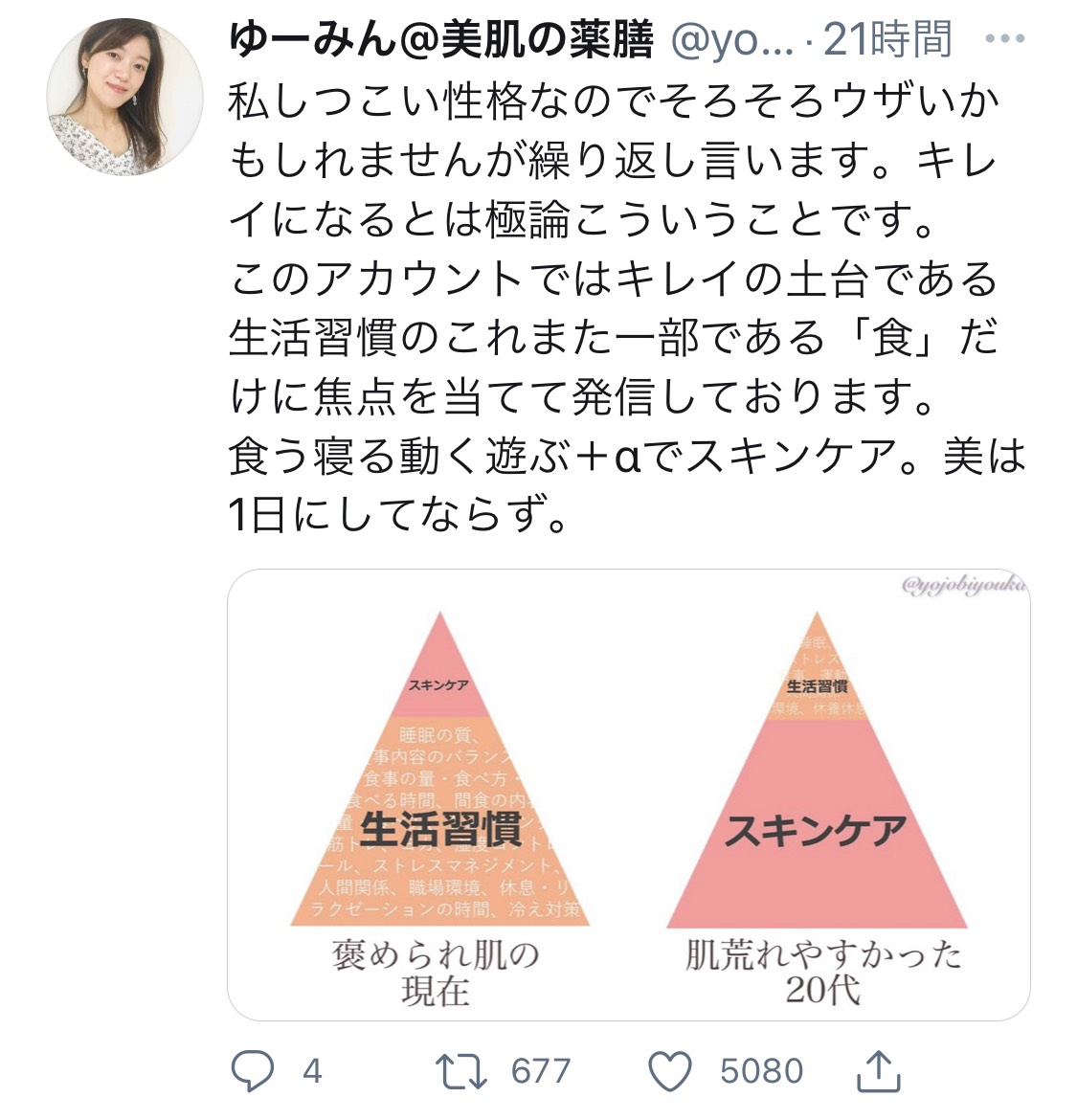 漢方の先生で美肌の薬膳をツイートされている方なんですが、肌荒れしやすかった20代はスキンケアを頑張って、褒められ肌になった現在は生活習慣を気を付けていると。