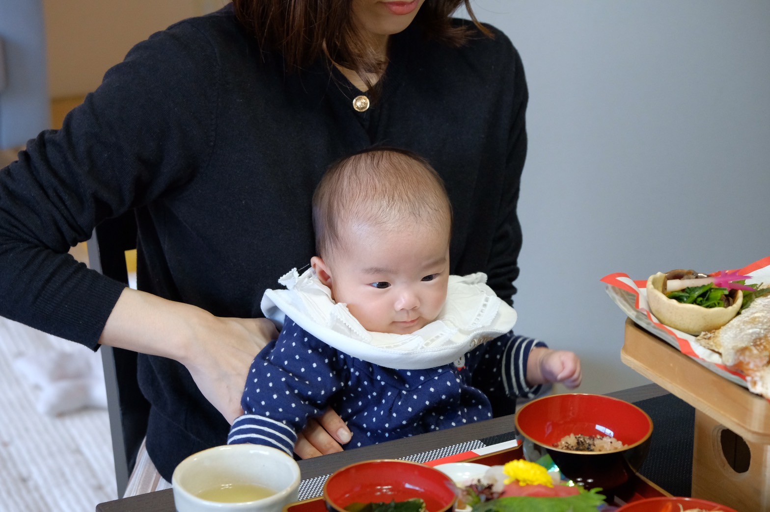 年越しそばを食べて、初詣に行って、おせち料理を食べて、先日はお食い初め。