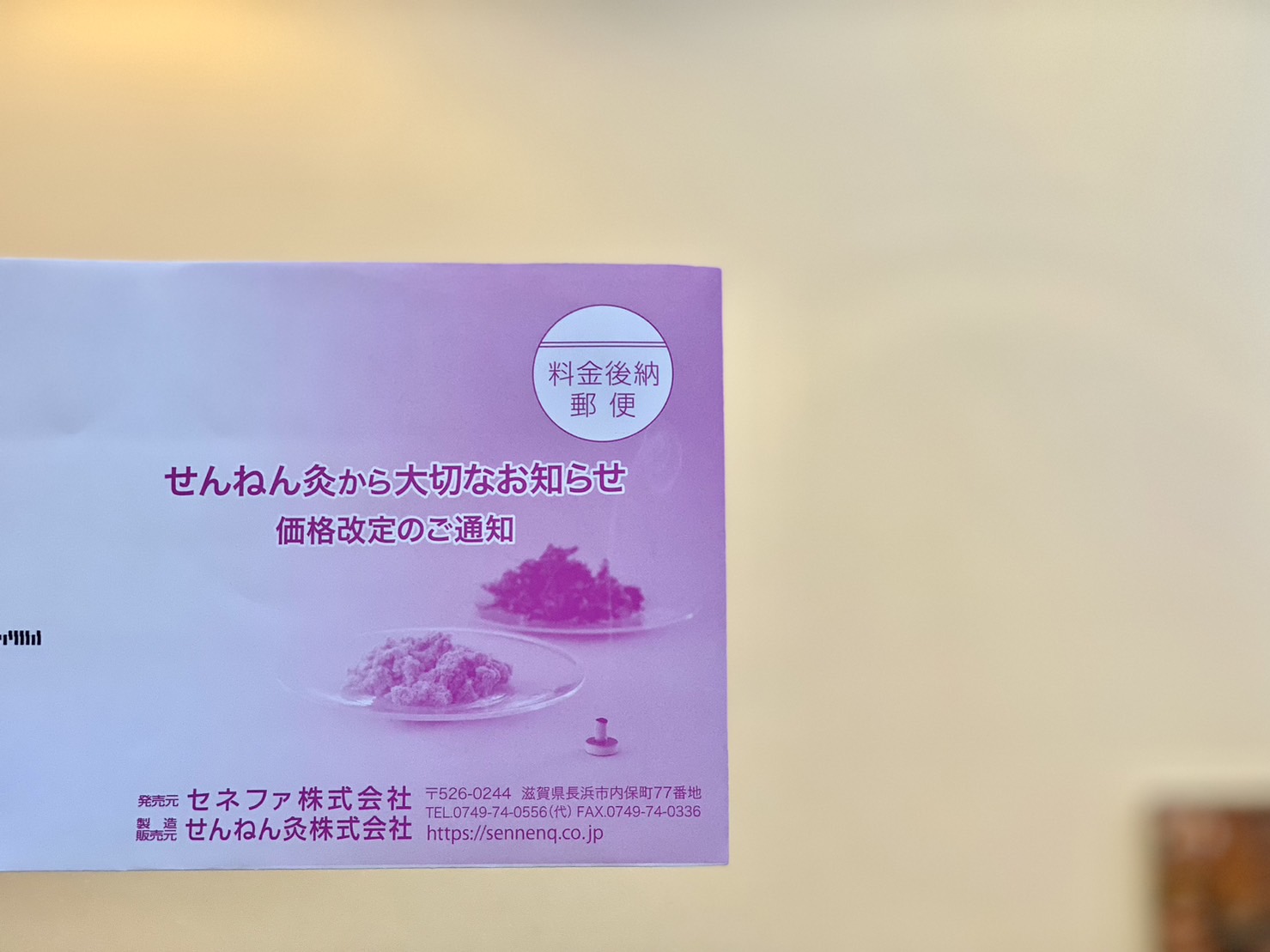 そんな中、今回せんねん灸さんから価格改定の通知が届きました。