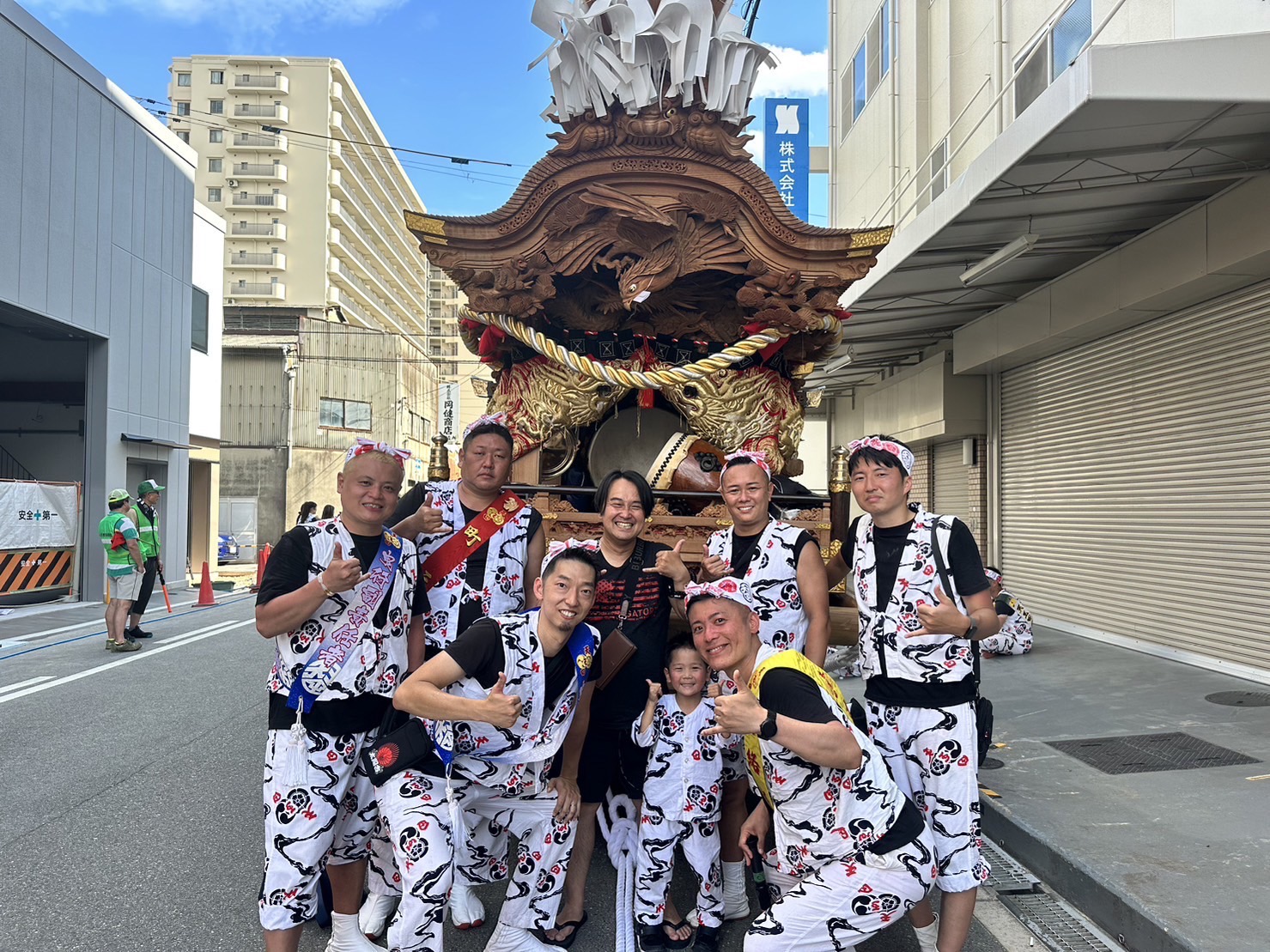 猛暑に次ぐ猛暑。若衆や後ろを押すメンバーを中心に、疲労困憊な中みんな自分のからだにムチを打って頑張ってくれたお陰で、ほとんどコースもカットすることなく曳行することが出来ました。