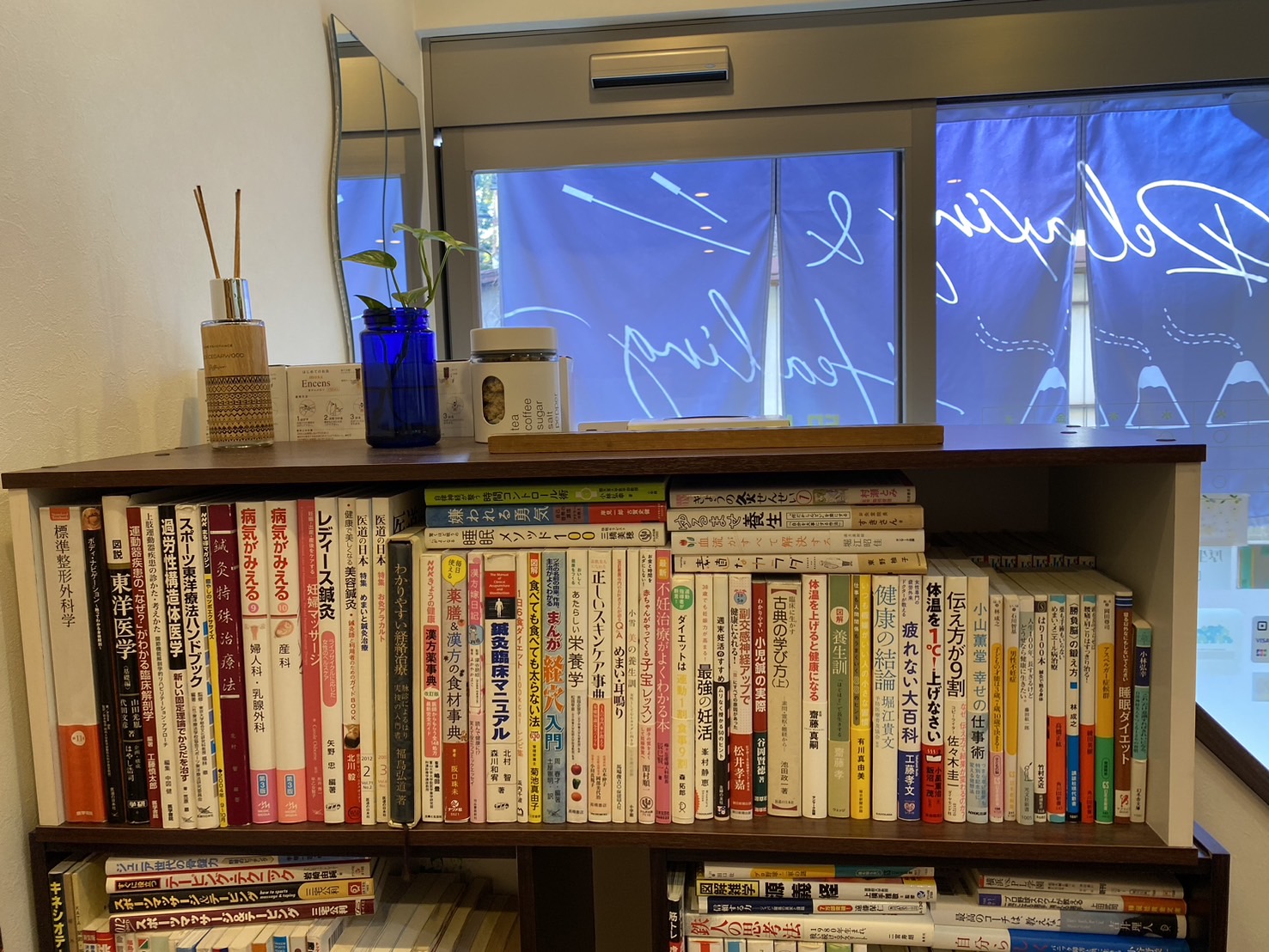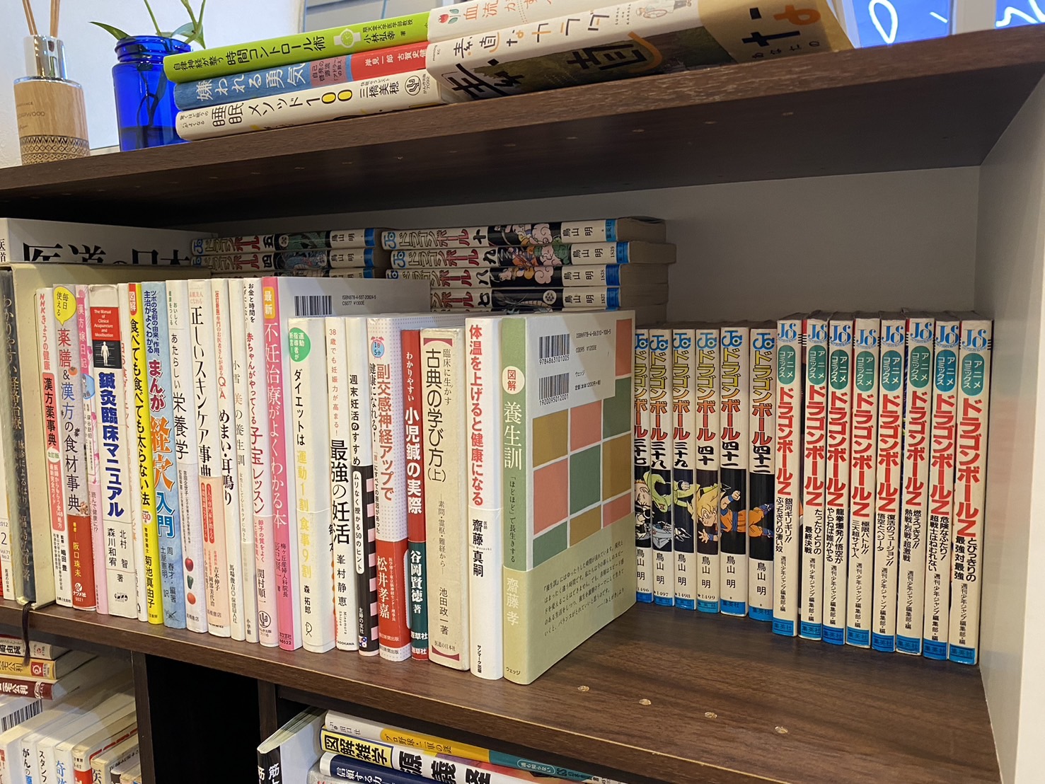 当鍼灸院の本棚。ご存知ない方もおられますが、たくさんの本の奥には実はマンガ本、ドラゴンボールの本が隠れているんです。