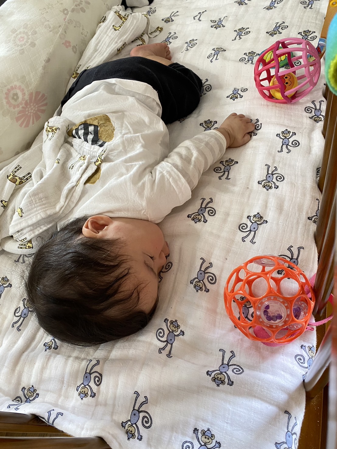普段はあまり乗らないベビーカーに自ら乗り、日除けのカバーも自分で閉めて世界をシャットアウト。笑