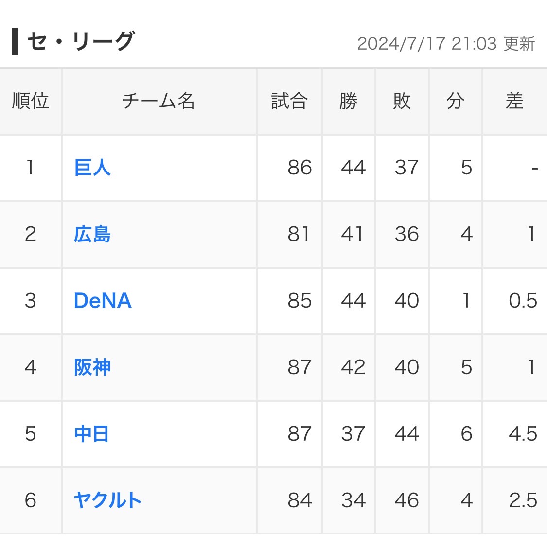 特にセ・リーグは5位の中日までそこまでゲーム差がなく、それどころかまだ最下位のヤクルトまで後半戦の勢い次第では優勝の可能性が残っています。