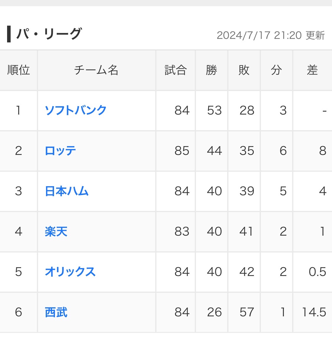 日本もまもなく前半戦が終わりオールスターブレイクに入りますが、現在の順位をおさらいしたいと思います。