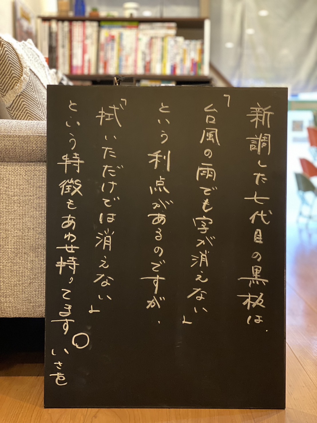 新調した黒板は、「 台風の雨でも字が消えない 」という利点と「 黒板の字が消しづらい 」という特徴を持ち合わせております。これもまた個性で良いものですね。