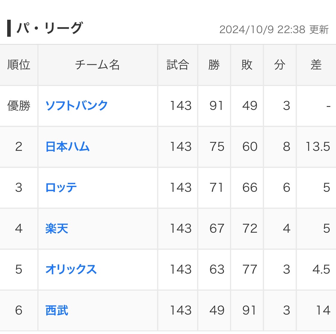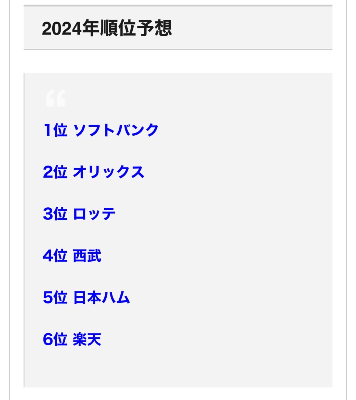 1位ソフトバンク、3位ロッテは的中。その他は当てることが出来ませんでした。