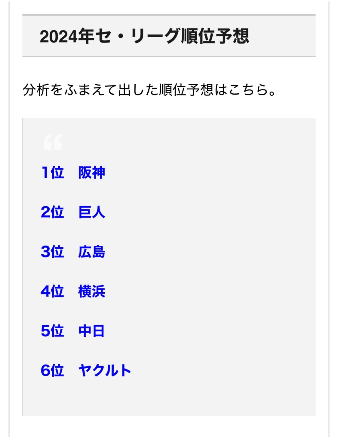 「 どこが上位にきてもわからないぐらい混戦になる 」と添えましたが、阪神が1位、巨人が2位、以下は上記のような順位で予想をしました。
