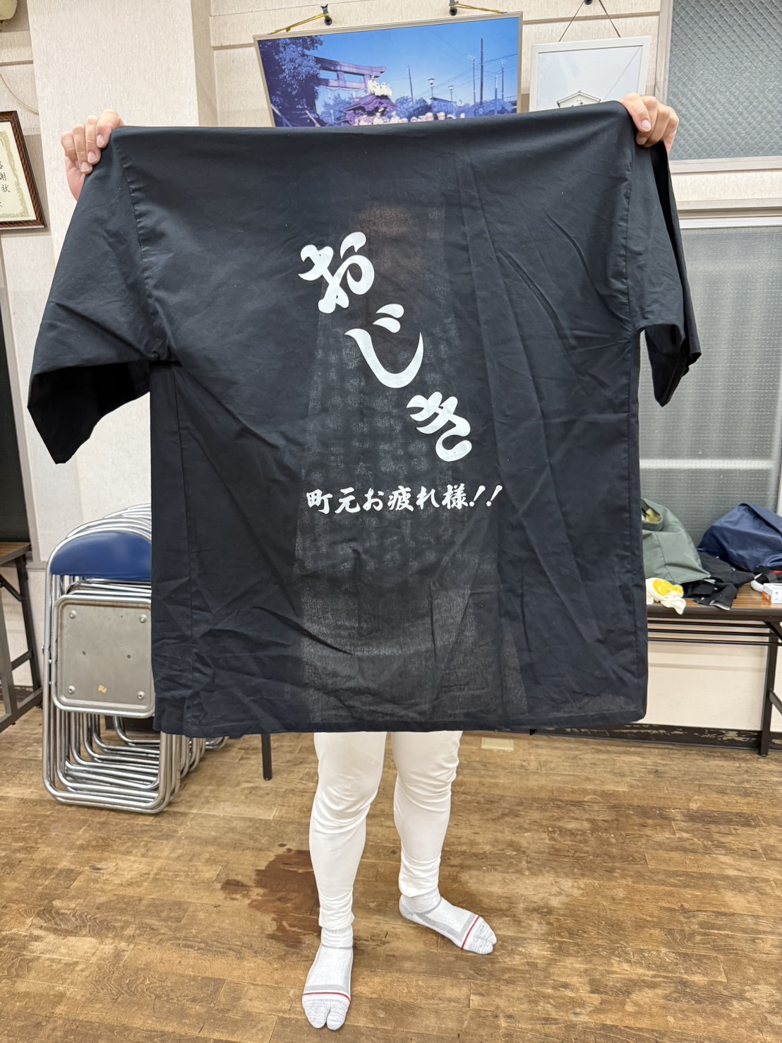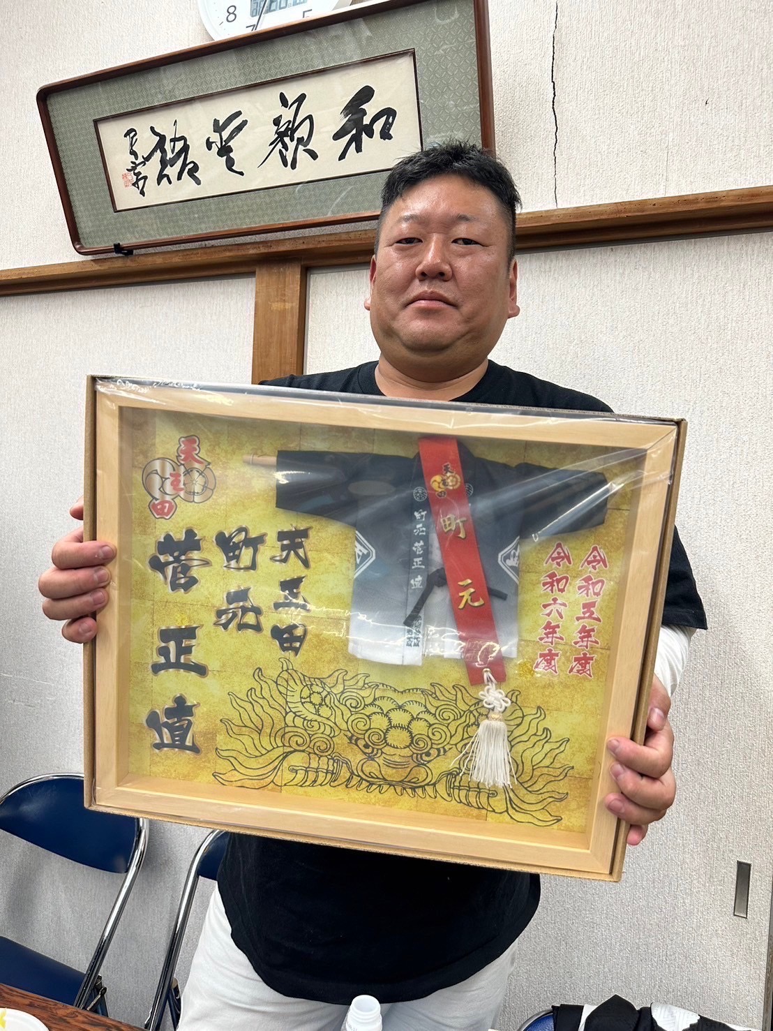 時を同じくして、同じく2年間の町元を終えた今西雄紀氏は素晴らしく渋い記念法被をプレゼントしてもらっていました。