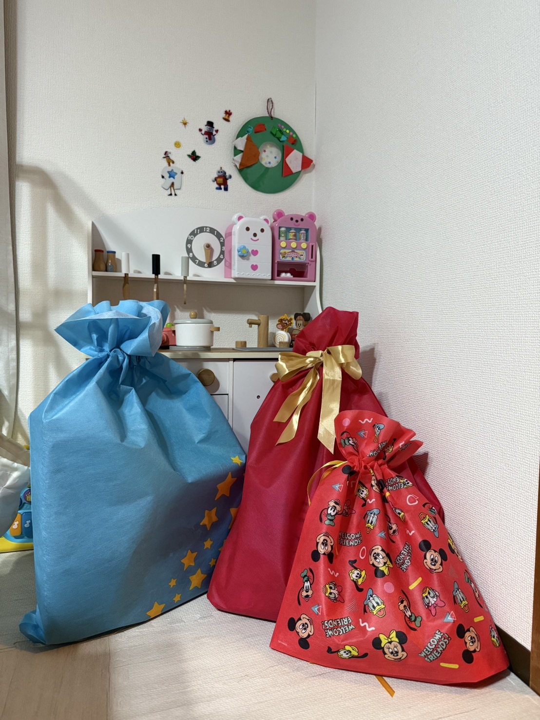 夜、ボクたちが寝ている間にどうやらサンタさんがどこからか入ってくれていたようで、こどもたちが遊ぶスペースにプレゼントが置かれてありました。