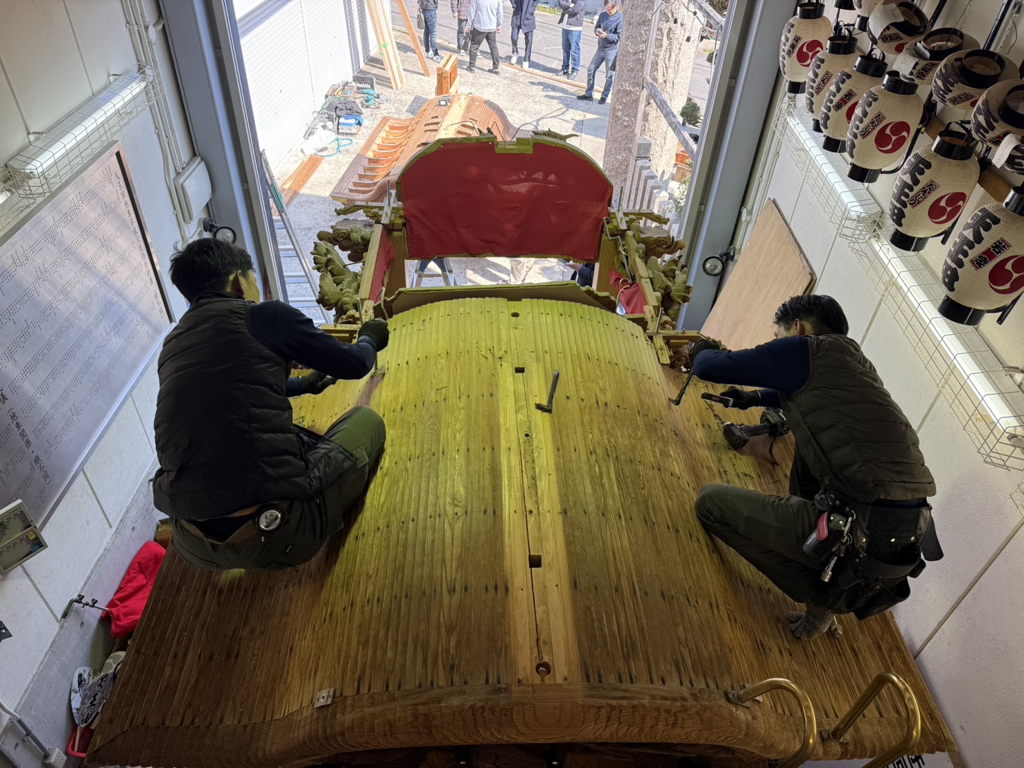 だんじりの屋根を外し、大屋根と小屋根に分けて作業を開始。