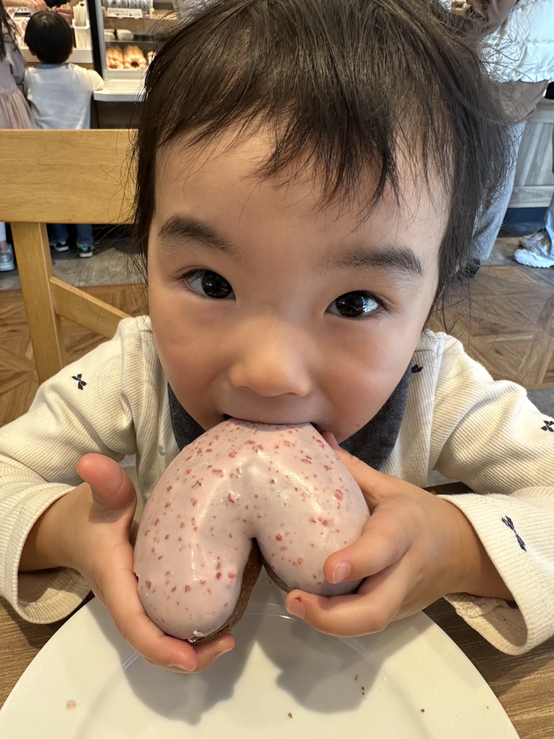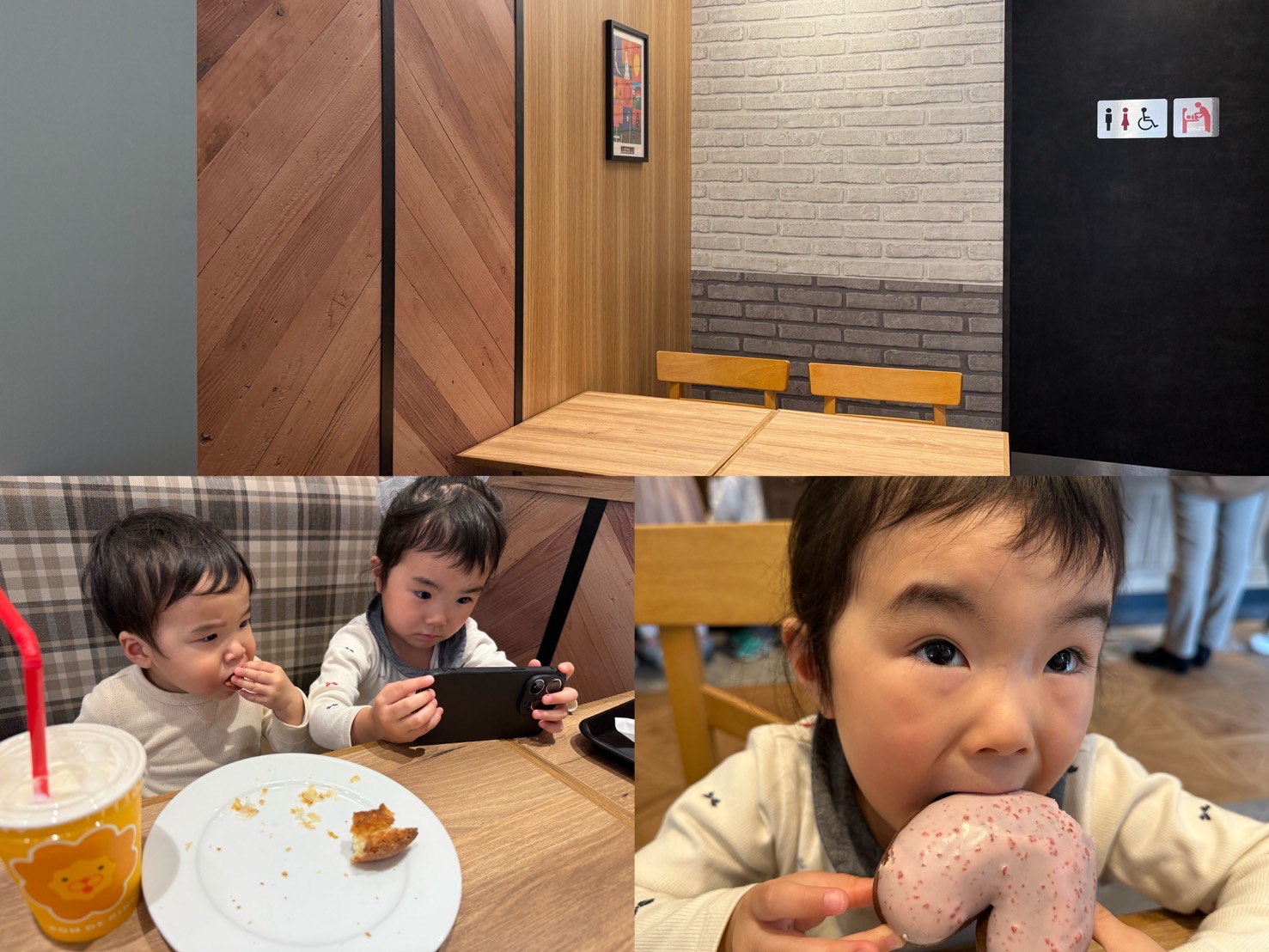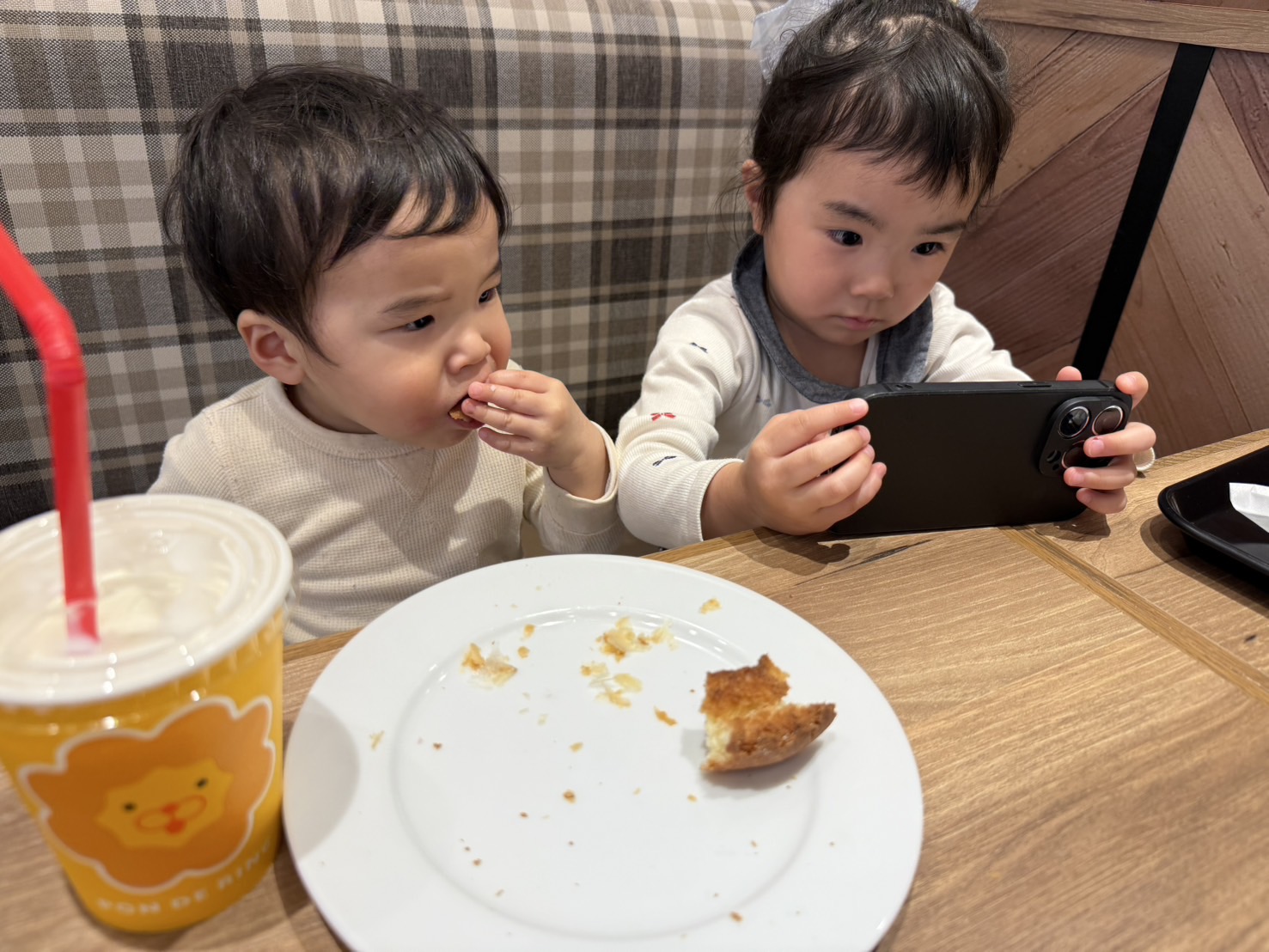 早々に食べ終えてYouTubeを見る3歳の娘と、お構いなしに延々とドーナツを食べ続ける1歳の息子。