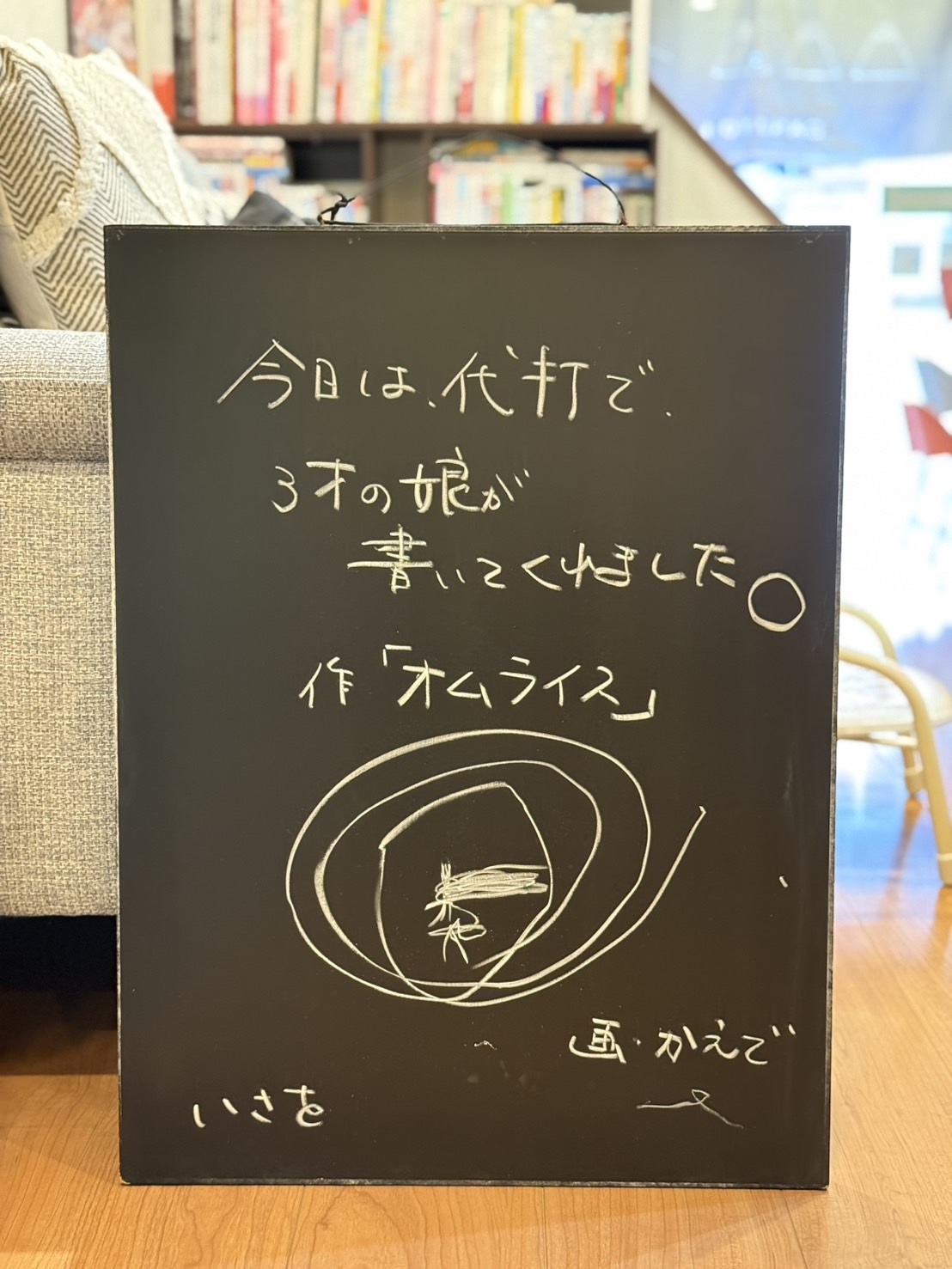 幼稚園に行く前に娘が今日の黒板を書いてくれました。またいつか書いてもらおうと思います^^