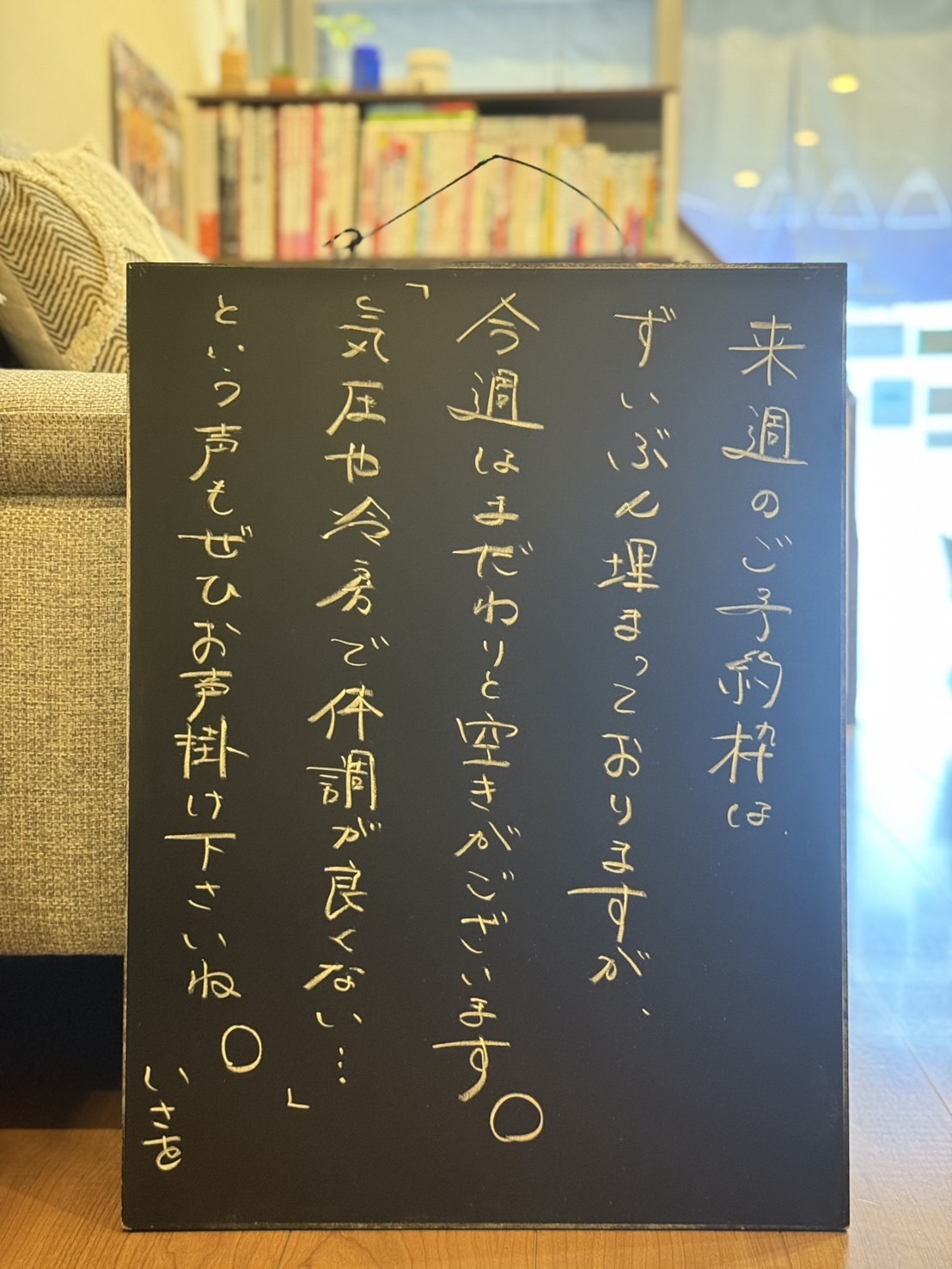 黒板にも書かせていただきましたが、気温や気圧、冷房の影響で体調不良を訴える方が増えてまいりました。