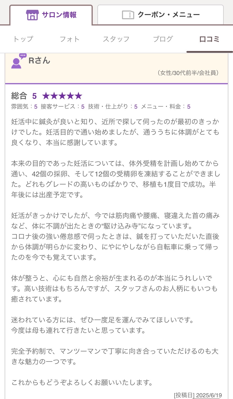 心拍が確定するまでのご不安な時期、つわりがひどくてお仕事もままならない状況の際もずっと鍼灸にてサポートさせていただき、現在安定期に入られ、先日素敵なレビューをホットペッパービューティーの方に残して下さったのでご紹介させていただきます。