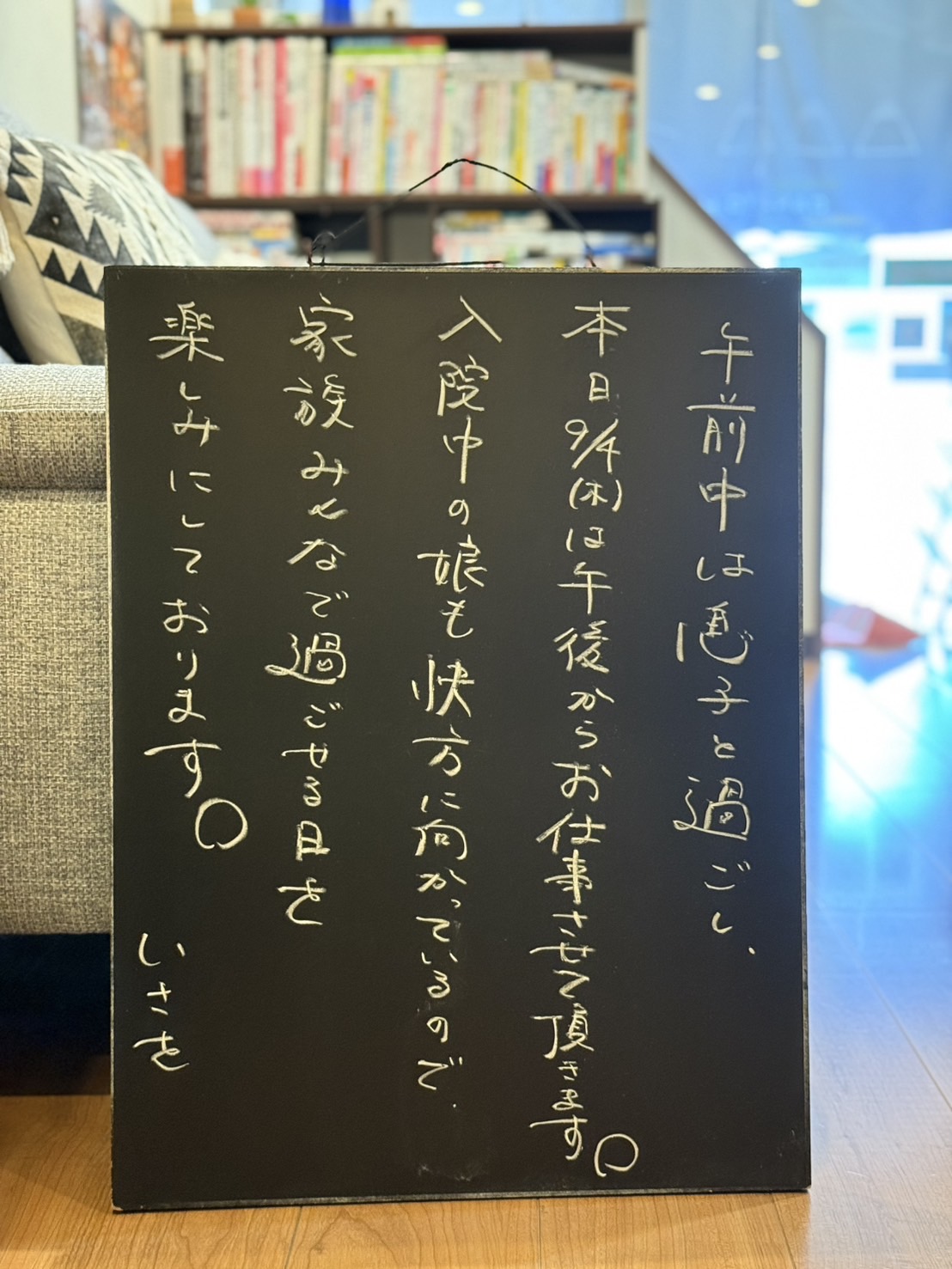 なかなか普段こういう働き方をしていないので慣れませんが、娘が帰ってきてからも今日のような働き方をたまに行うのもいいのではないかなと感じております。