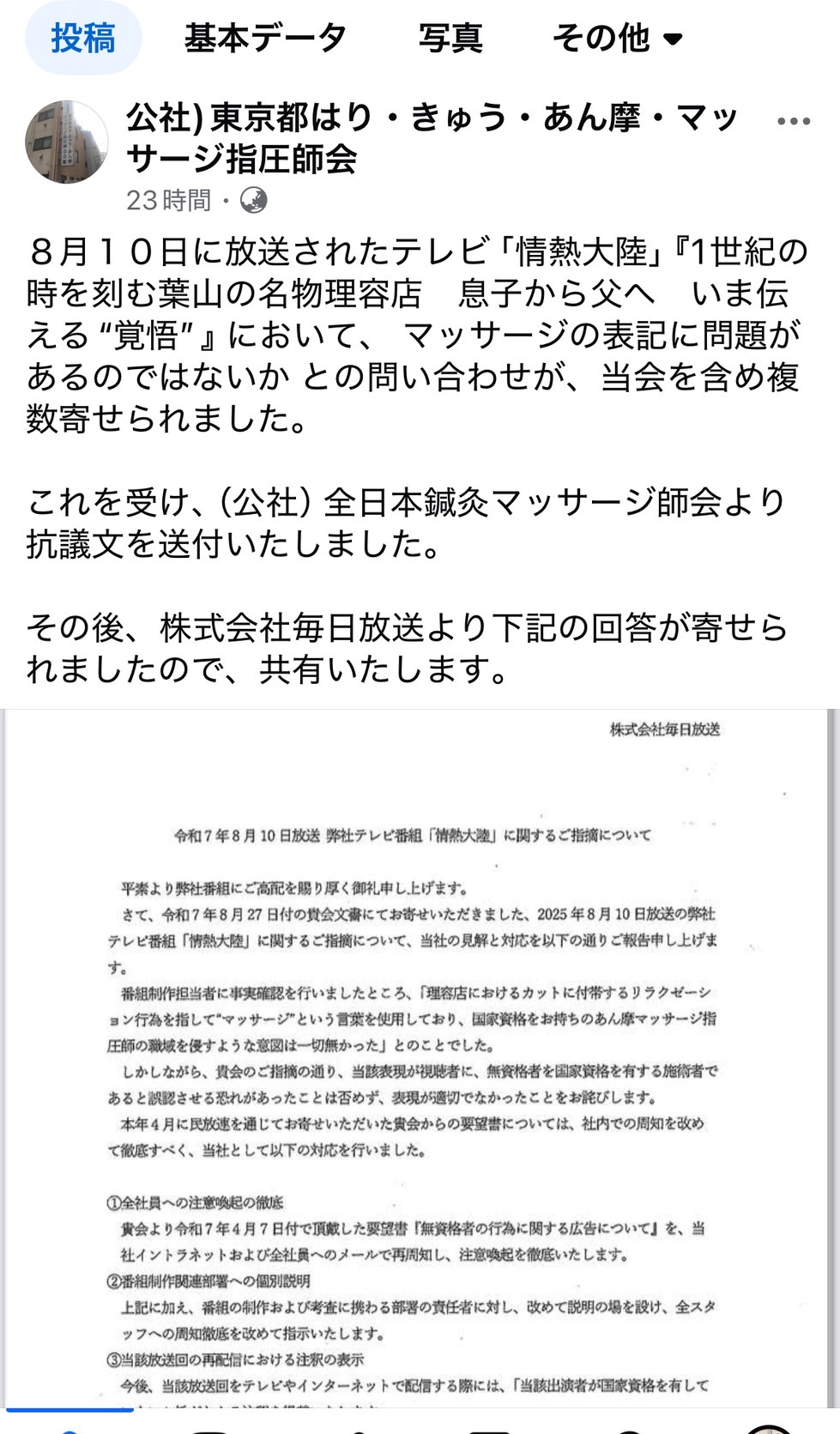 それに対して「マッサージ」というのは「国家資格を有するあんま・マッサージ・指圧師にみが使える表現」であり、表記等に問題があるのではないかと業界団体さんが抗議文を送られたそう。