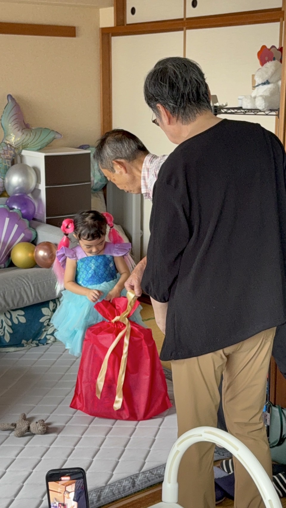 ご飯を食べた後に、たくさんの可愛いプレゼントをもらって大喜びする娘。