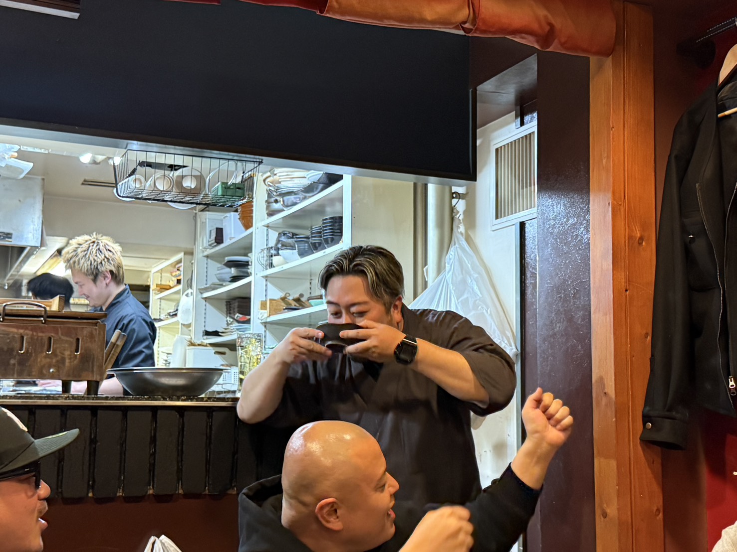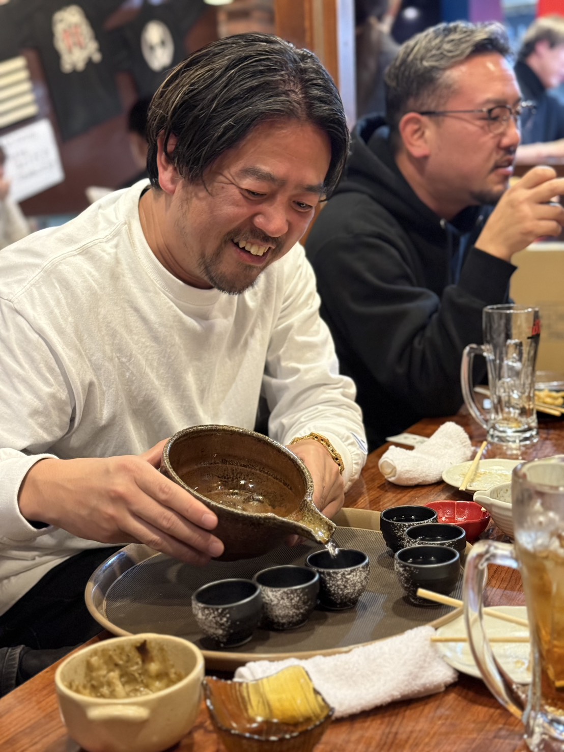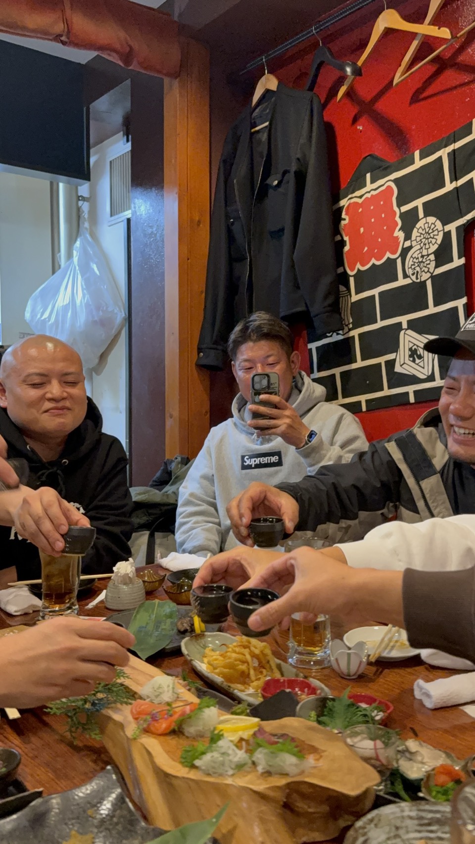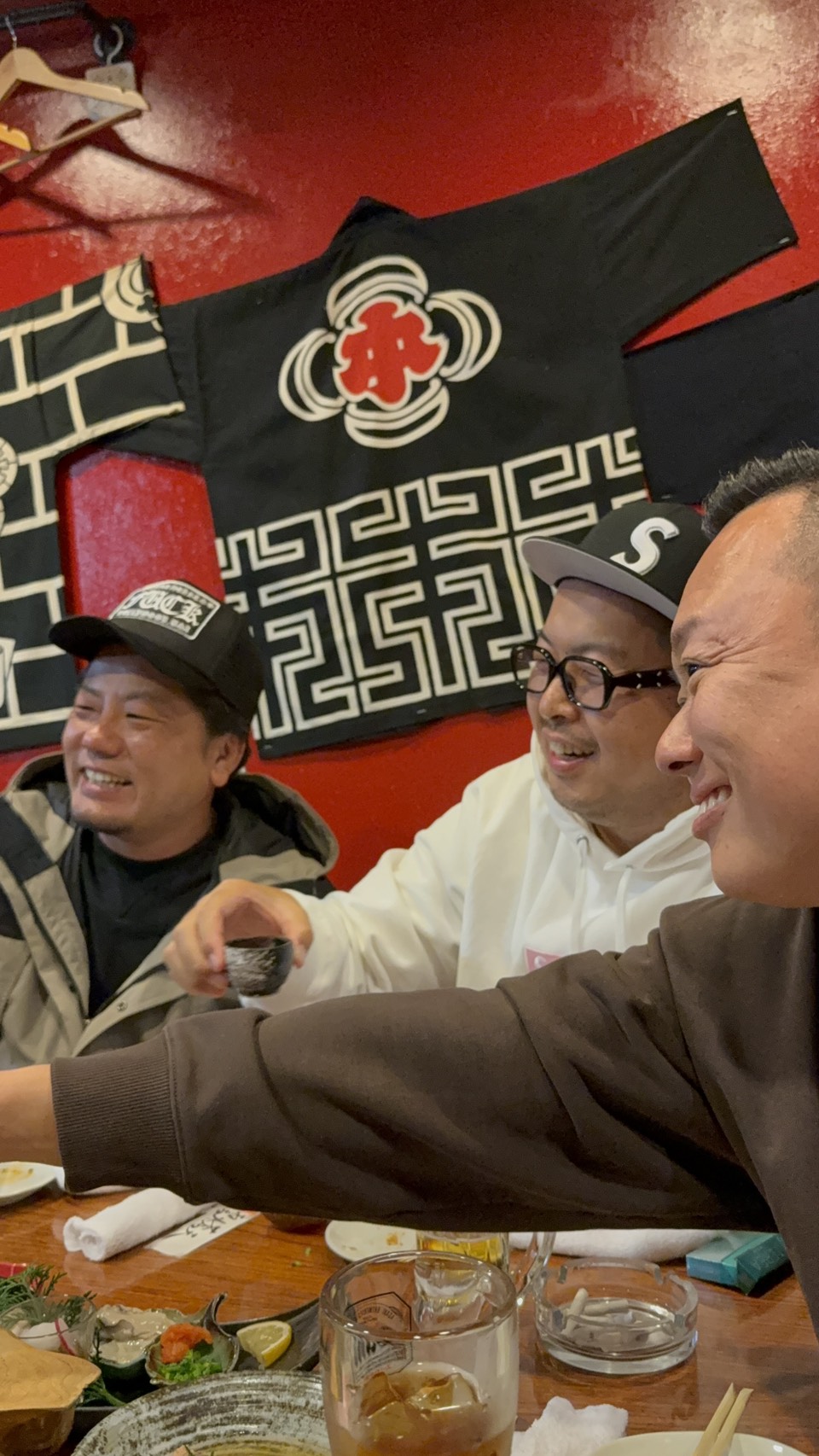 そんな嬉しい出会いもありながら、美味しいお料理をいただいていると、某プロ野球チームの看板選手たちのスーツを手掛ける伊庭先輩が突然火をそそぎ、いや、お猪口に日本酒を注ぎ始めて会は一気にヒートアップ。