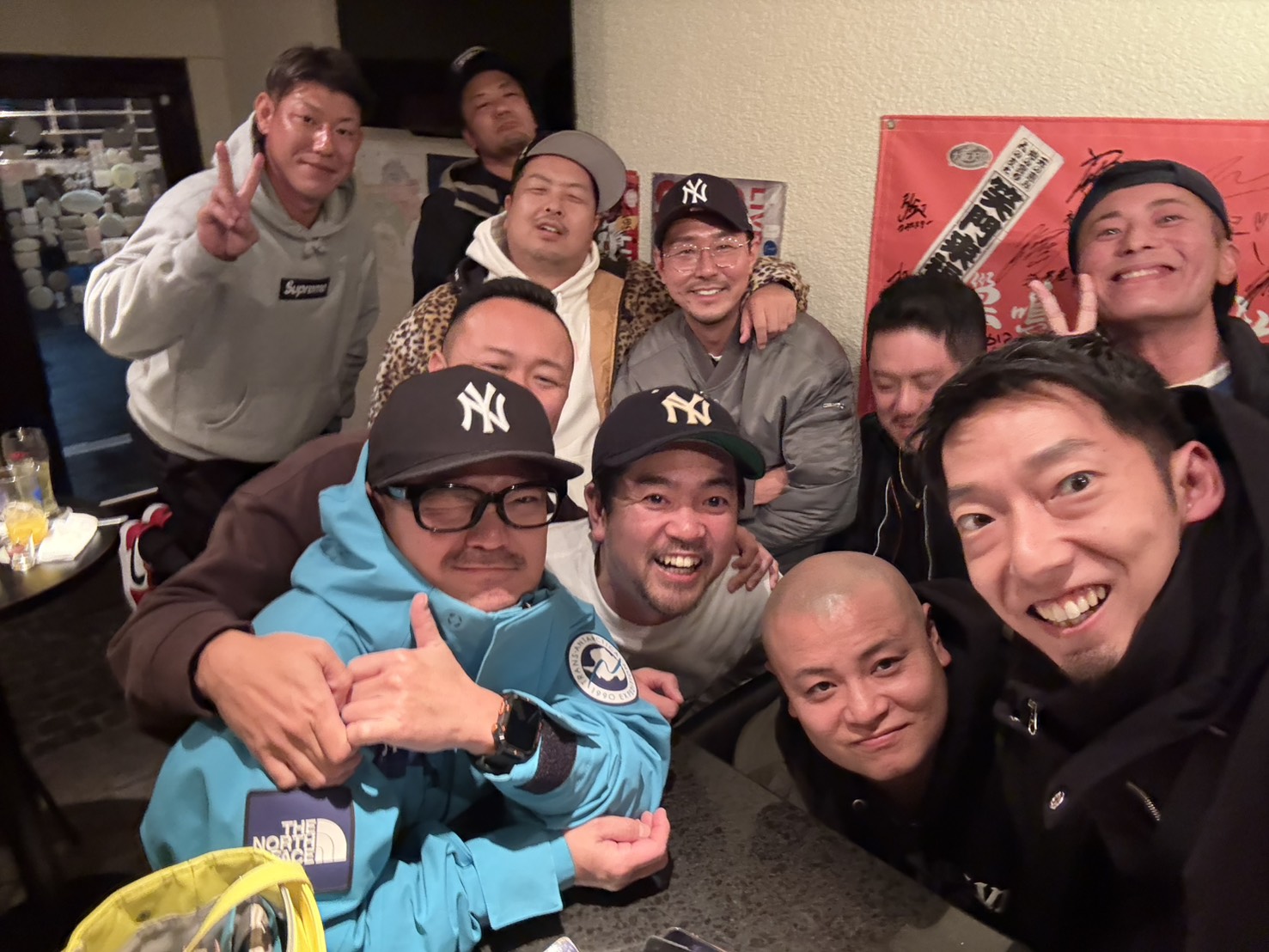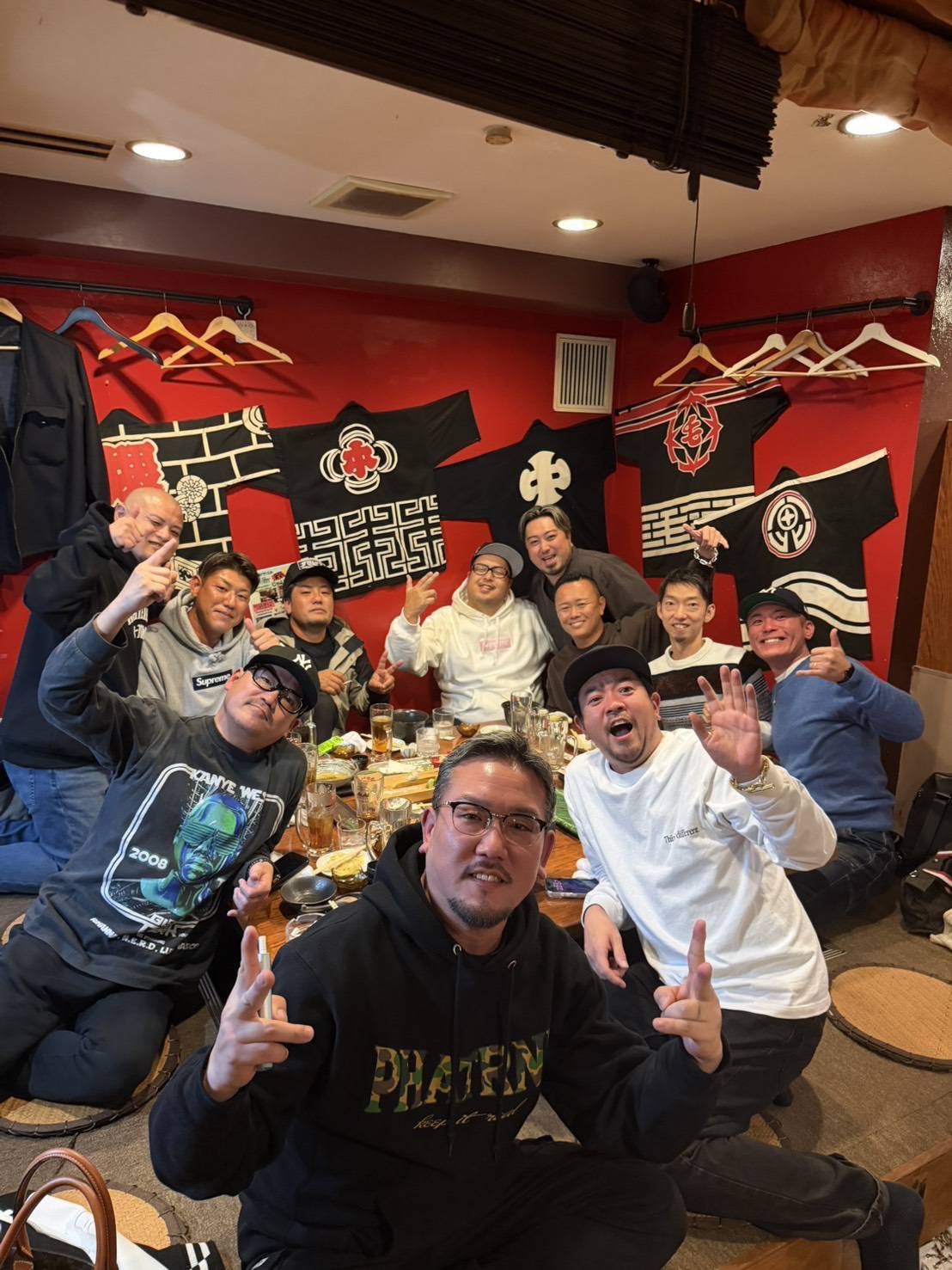 お店はひっきりなしにお客さんが来られて尋常じゃないぐらい繁盛していたのですが、ボクらが伺った時に数十名で忘年会をされていた団体の社長さんがボクたちの知り合いで、ご夫妻、そしてその会社さんで働かれている鴫野のだんじりの先輩と記念撮影。
