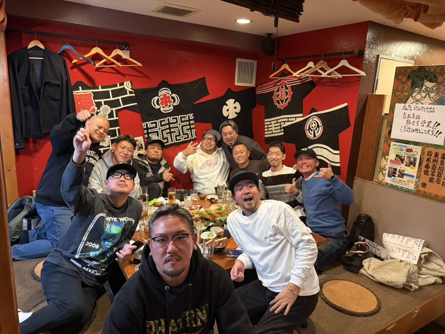 お店はひっきりなしにお客さんが来られて尋常じゃないぐらい繁盛していたのですが、ボクらが伺った時に数十名で忘年会をされていた団体の社長さんがボクたちの知り合いで、ご夫妻、そしてその会社さんで働かれている鴫野のだんじりの先輩と記念撮影。