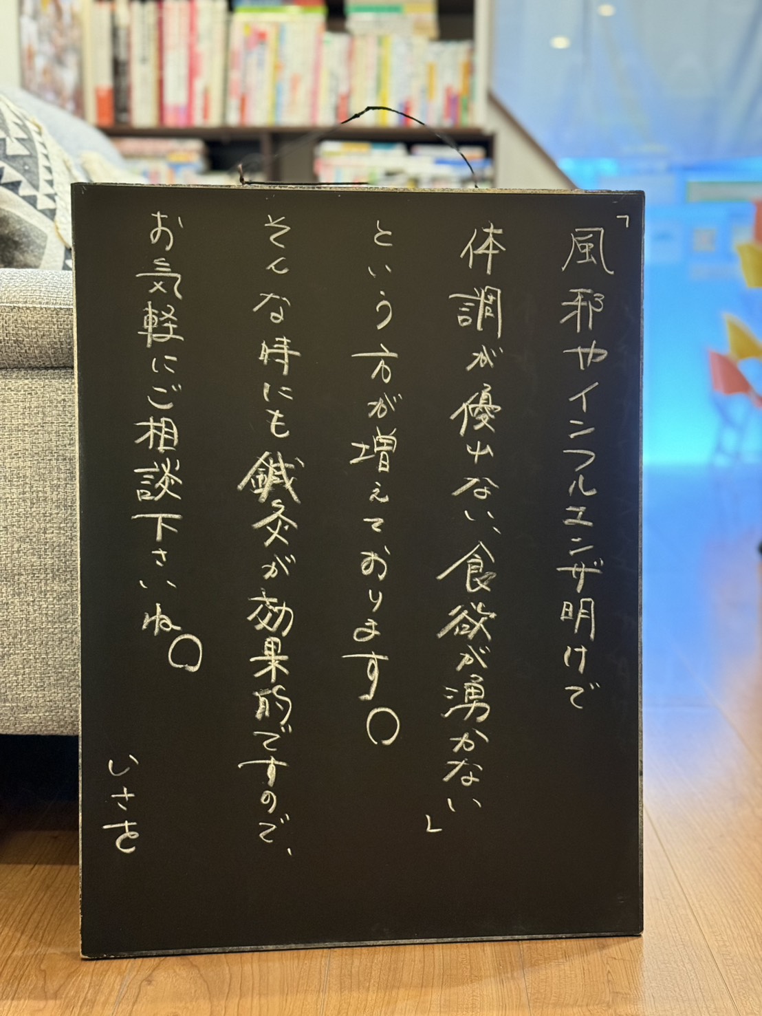 良くなるまでじっくり休むことが出来れば一番なのですが、家事や育児やお仕事など、日々のタスクは変わらず続いていくかと思いますので、おからだを整えにいらしていただけたら嬉しいです^^